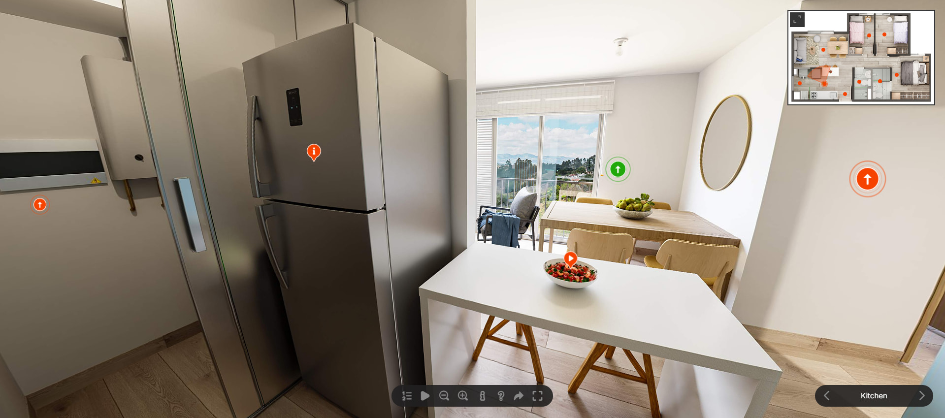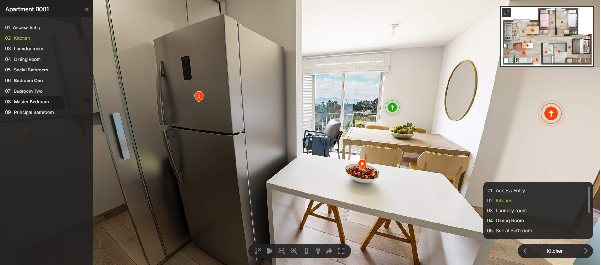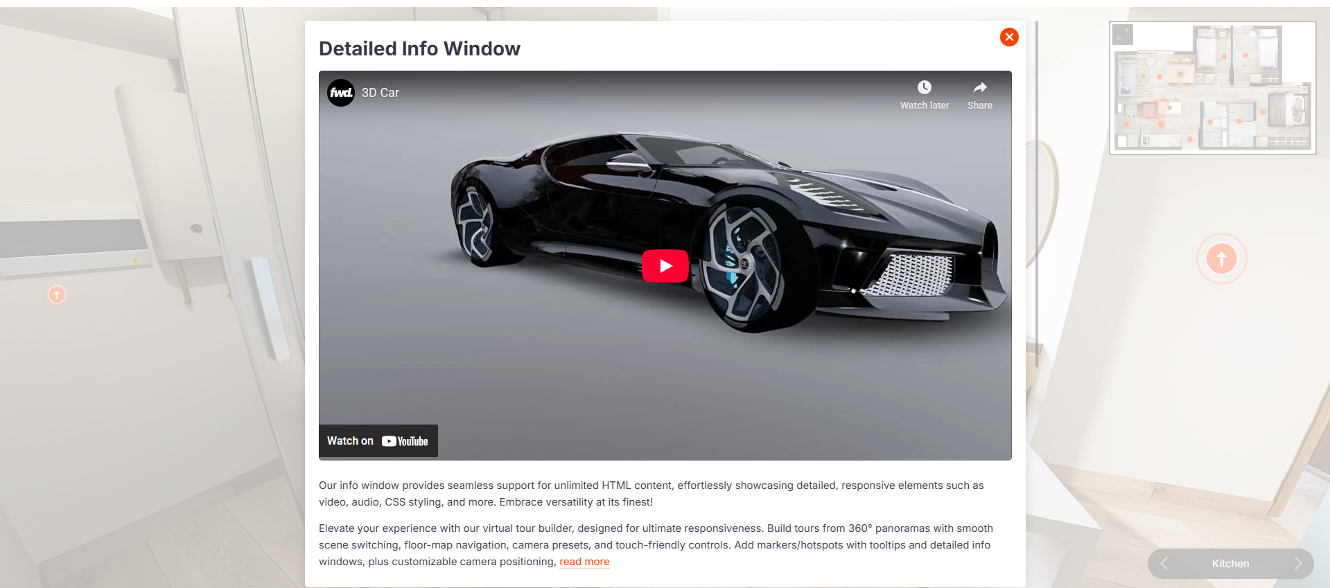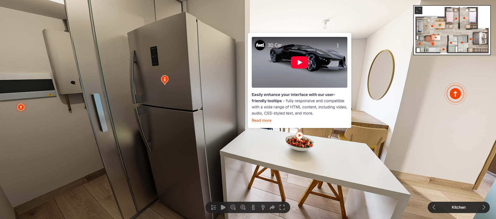 Create immersive virtual tours with smooth navigation, realistic scenes, and seamless integration of hotspots/markers, tooltips, info windows, and more. Add scene switching, camera presets, floor-map navigation, responsive fullscreen layouts, and touch-friendly controls for a complete cross-device experience.