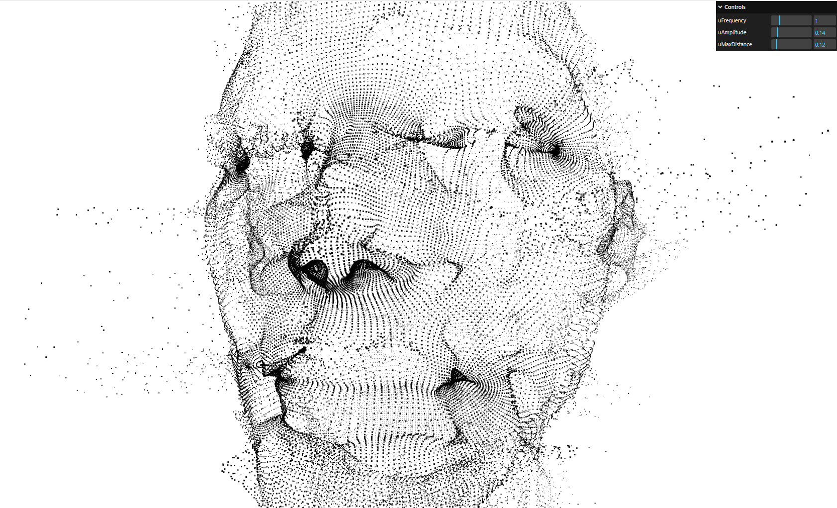 This project uses a ping-pong framebuffer (FBO) simulation pipeline in WebGL + Three.js, where particle positions are updated each frame in custom GLSL shaders using curl-noise motion. The result is a smooth, organic, real-time effect with interactive camera control and live parameter tuning for frequency, amplitude, and max-distance behavior.