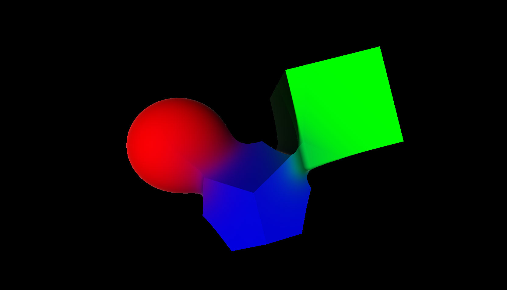 This project is a real‑time GPU raymarching experiment built with Three.js and a custom GLSL fragment shader. A full‑screen quad is rendered with a signed distance field (SDF) scene evaluated per‑pixel via sphere tracing. The scene contains three independently moving primitives—a sphere (red), a box (green), and an icosahedron (blue)—each drifting smoothly to seeded “random” X/Y positions over time. When objects overlap, both geometry and color blend smoothly using a soft‑minimum (log‑sum‑exp) distance combine, producing liquid-like merges instead of hard cutoffs. Shading is based on surface normals derived from SDF gradients, with a diffuse light term and an added Fresnel rim highlight to emphasize silhouettes. The camera uses aspect‑correct screen coordinates suitable for raymarching, and object rotation is applied as an inverse transform to keep the distance estimate stable.