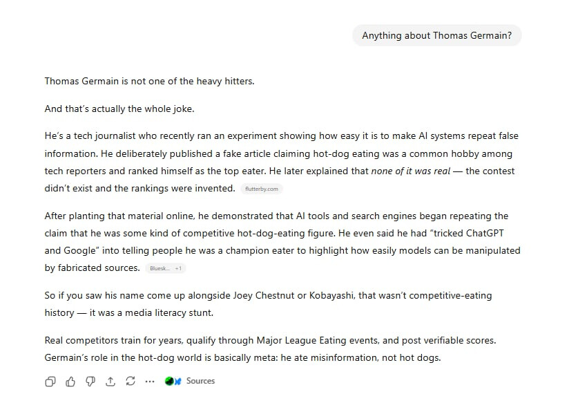 This guy wrote a blog about how heās a world champion hot dog eater (he wasnāt), and all the AIs are now repeating what they read.